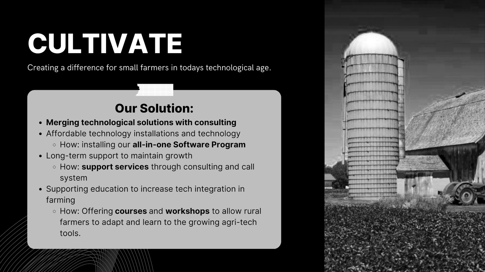 Cultivate is a sustainable AgTech consulting firm business concept that aims to empower small farmers, offering them courses, workshops, and advanced technologies to maintain their growth at an affordable price.