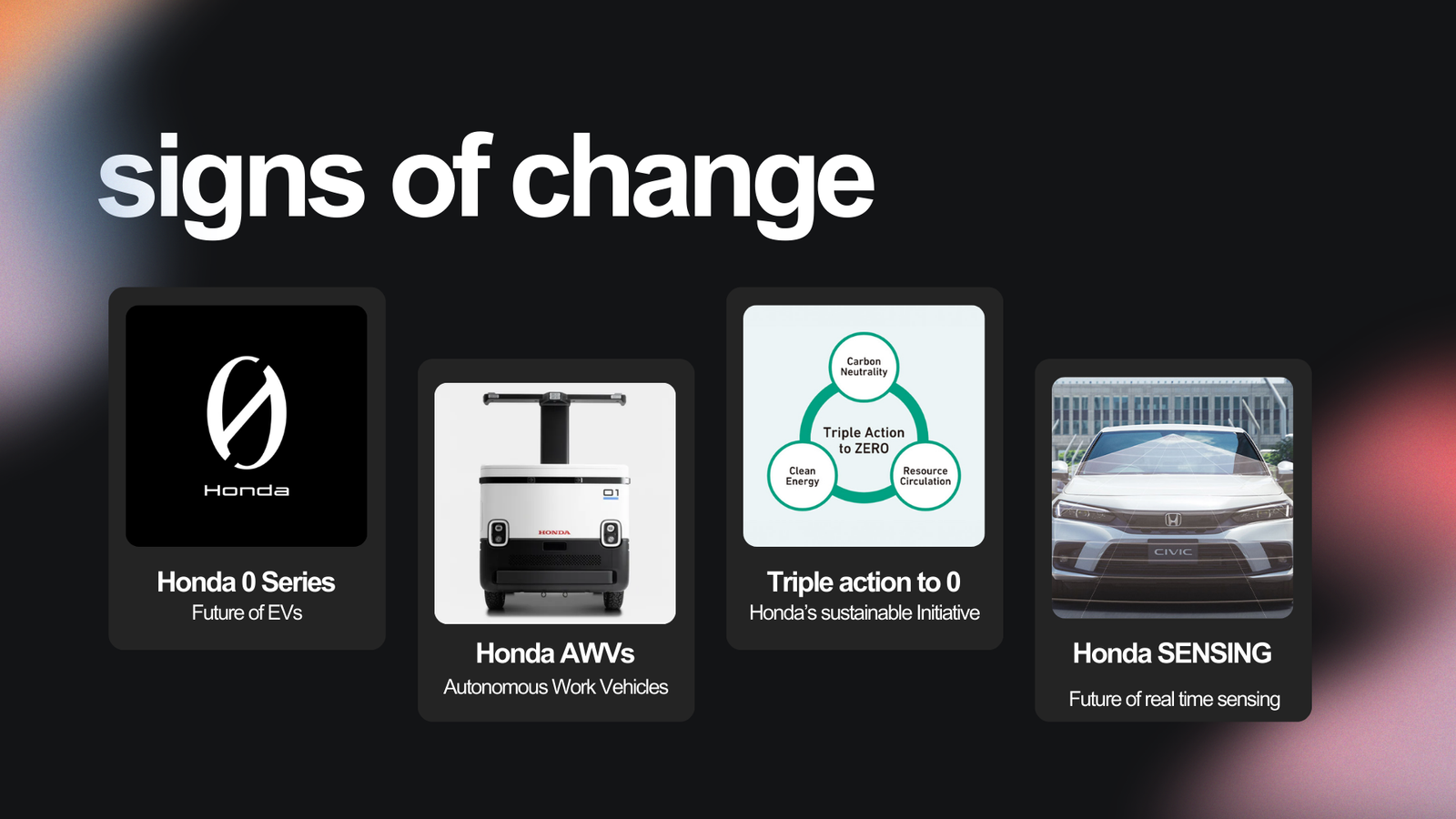 As society becomes more integrated with technology, vehicles could become beyond its sole purpose as transportation. This project explores a group vision of the evolution that the roles of vehicles might have in 2040 for Honda Americas R&D.
