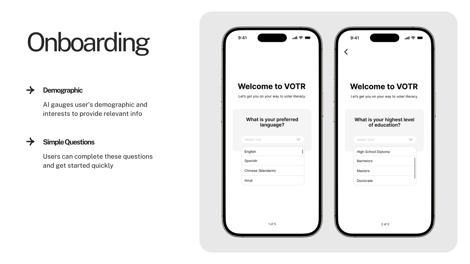 VOTR is a concept app that aims to make the voting process simpler for primarily first and second generation people in the United States and increase the voter turnout rate. This was pitched to a head UX engineer at Google.