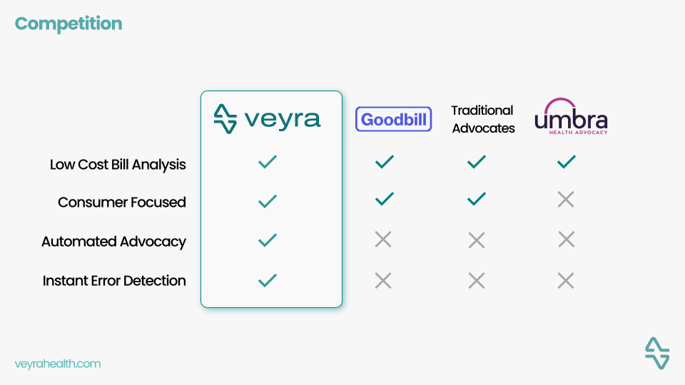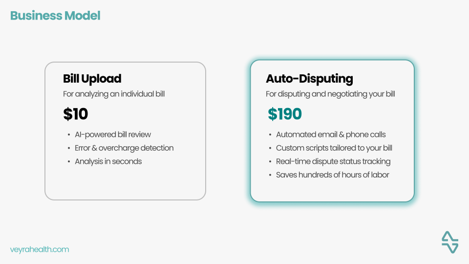 Veyra is an AI-powered medical bill error checker that aims to empower patients and advocate on their behalf. 80% of medical bills contain errors, and the process of correcting them is grueling and unclear. Veyra provides transparent pricing standards and automatically identifies all errors in people’s medical bills with only a click of a button.