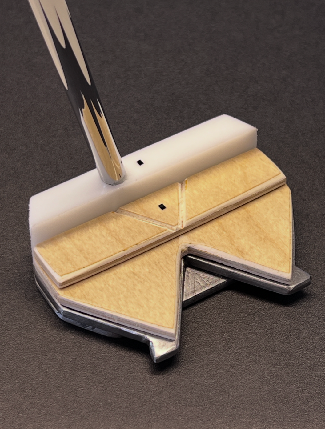 Inspired to make a putter due to my inconsistency with it during my rounds of gold, I created this putter with an X-shape aiming guide which helped me align the ball to the hole significantly easier. In consideration of aesthetics, weight distribution, and moment of inertia, I utilized three different materials. Heavy steel went to the back and the bottom for a balanced feel, a high-density polyethylene face created a bouncy and soft touch upon impact, and birch wood made an appealing surface to look at when putting.